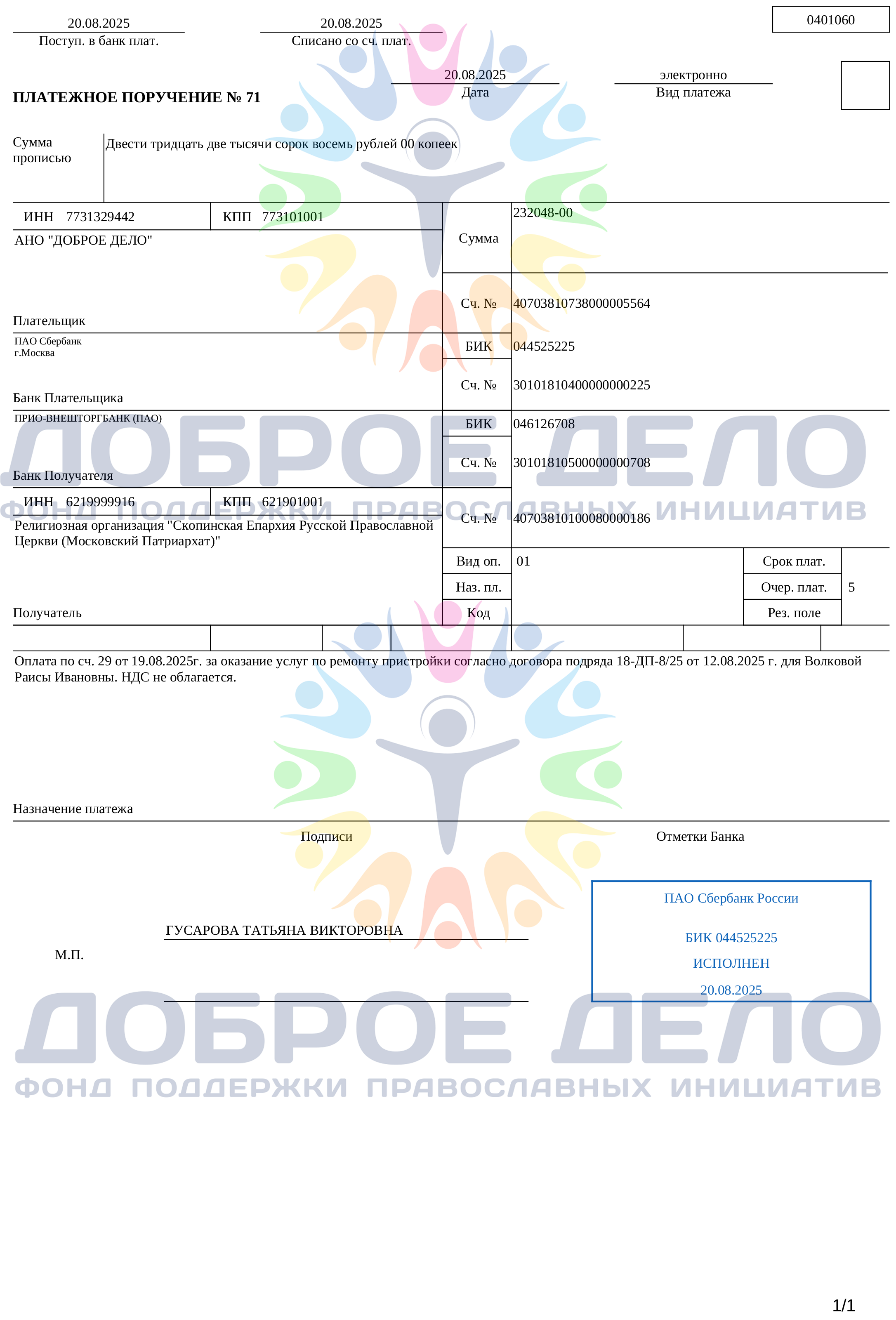 Благодаря вашему неравнодушию мы собрали средства для ремонта аварийной части дома и в два этапа ( аванс, финальный платеж) оплатили все работы. А Скопинская епархия организовала и проконтролировала ремонт.